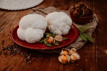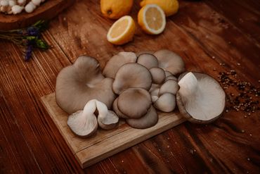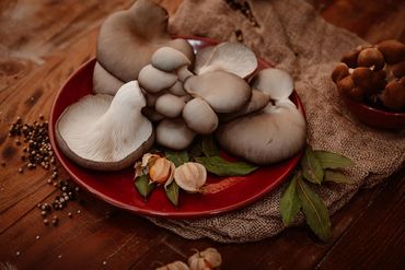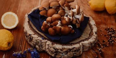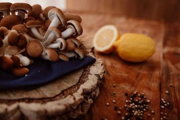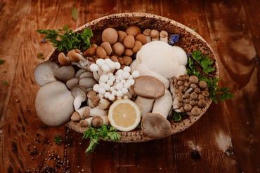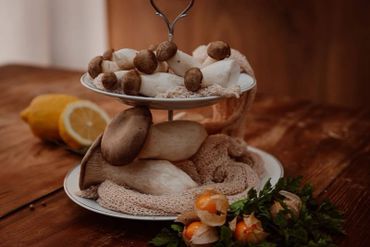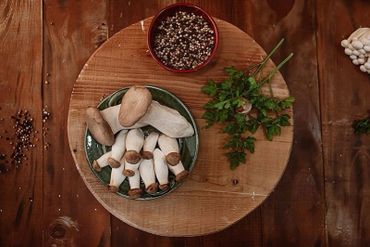 À mesa, vais poder saborear diferentes variedades de cogumelos frescos, cultivados localmente, entre eles, Pleurotus, Shiitake, Shimeji, Eryngii, Juba de Leão e Choupo.